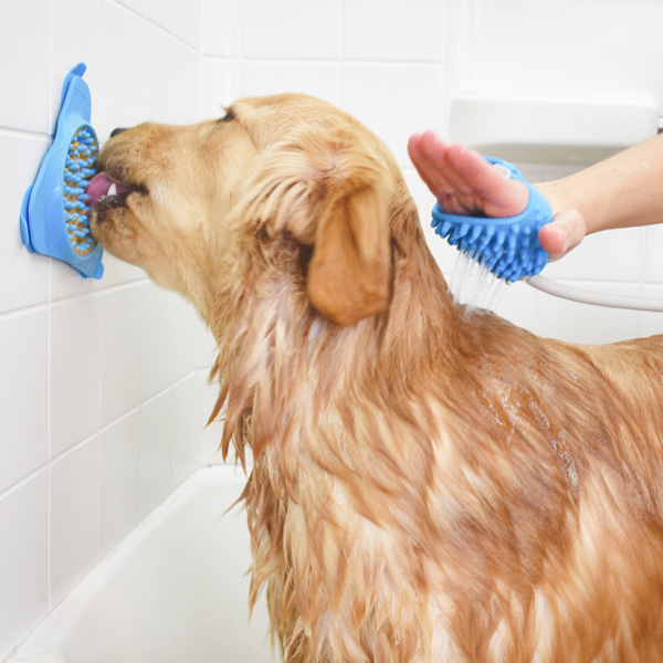 Auf dem boden liegt eine gummimatte und verhindert jedes ausrutschen. Die praxis zeigt das baden eine gleiche hund mit unserem haustier dusche effektiv sparen 50 wasser und 40 shampoo und die hälfte der üblichen zeit.